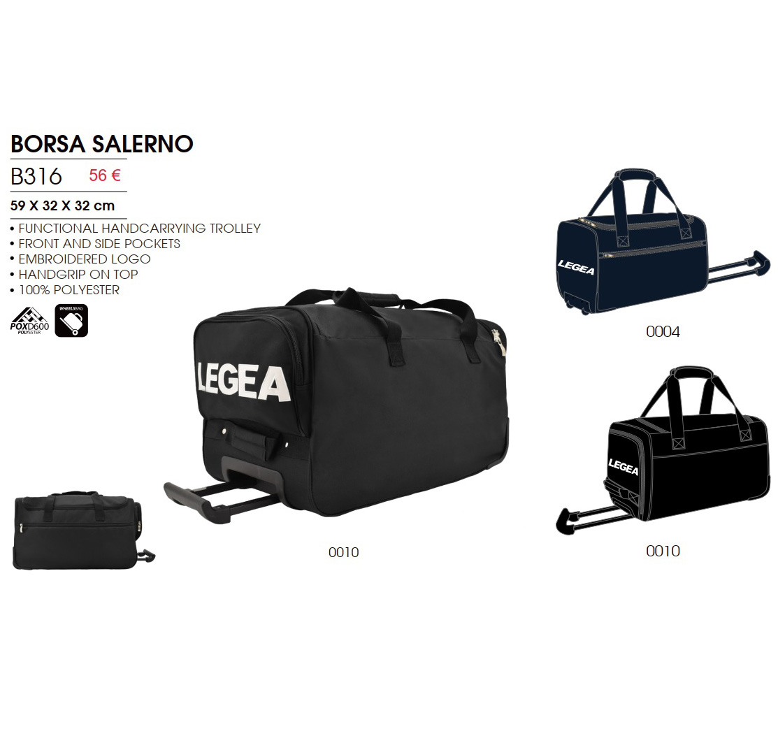 Σάκος από τη Legea από 100% πολυεστέρα με κεντημένο λογότυπο. Οι θήκες που διαθέτει εμπρός και στο πλάι μαζί με την χειρολαβή στο πάνω μέρος και τα ροδάκια στο κάτω την καθιστούν ιδανική λύση για την μεταφορά του εξόπλισμού σας. Διαστάσεις 59x32x32 cm.